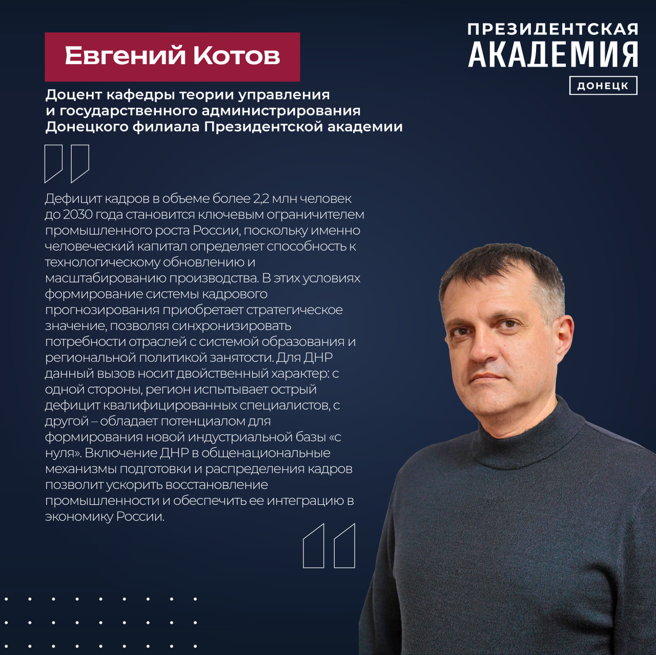 Кадровая политика России ориентирована на долгосрочное развитие человеческого капитала, интеграцию образования и производства, поддержку талантов и формирование управленческой культуры нового поколения. Ключевой опорой этой работы стал национальный проект «Кадры», который заложил основу для долгосрочного управления рынком труда.