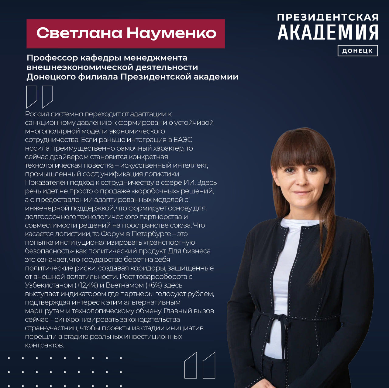 Системная работа по укреплению суверенитета и повышению влияния на мировой арене является государственным приоритетом. Международное сотрудничество развивается в различных секторах экономики — энергетике, машиностроении, фармацевтике, транспортно‑логистической сфере, науке и образовании.