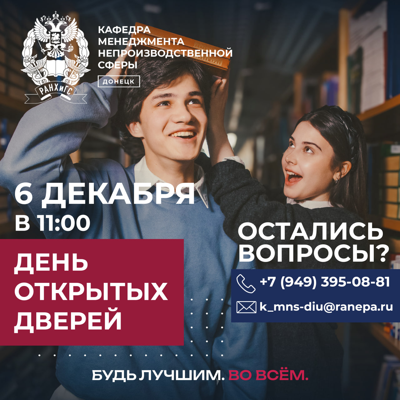 6 декабря 2025 г. в 11:00 приглашаем абитуриентов, школьников, родителей и всех интересующихся на День открытых дверей кафедры менеджмента непроизводственной сферы Донецкого филиала Президентской академии!