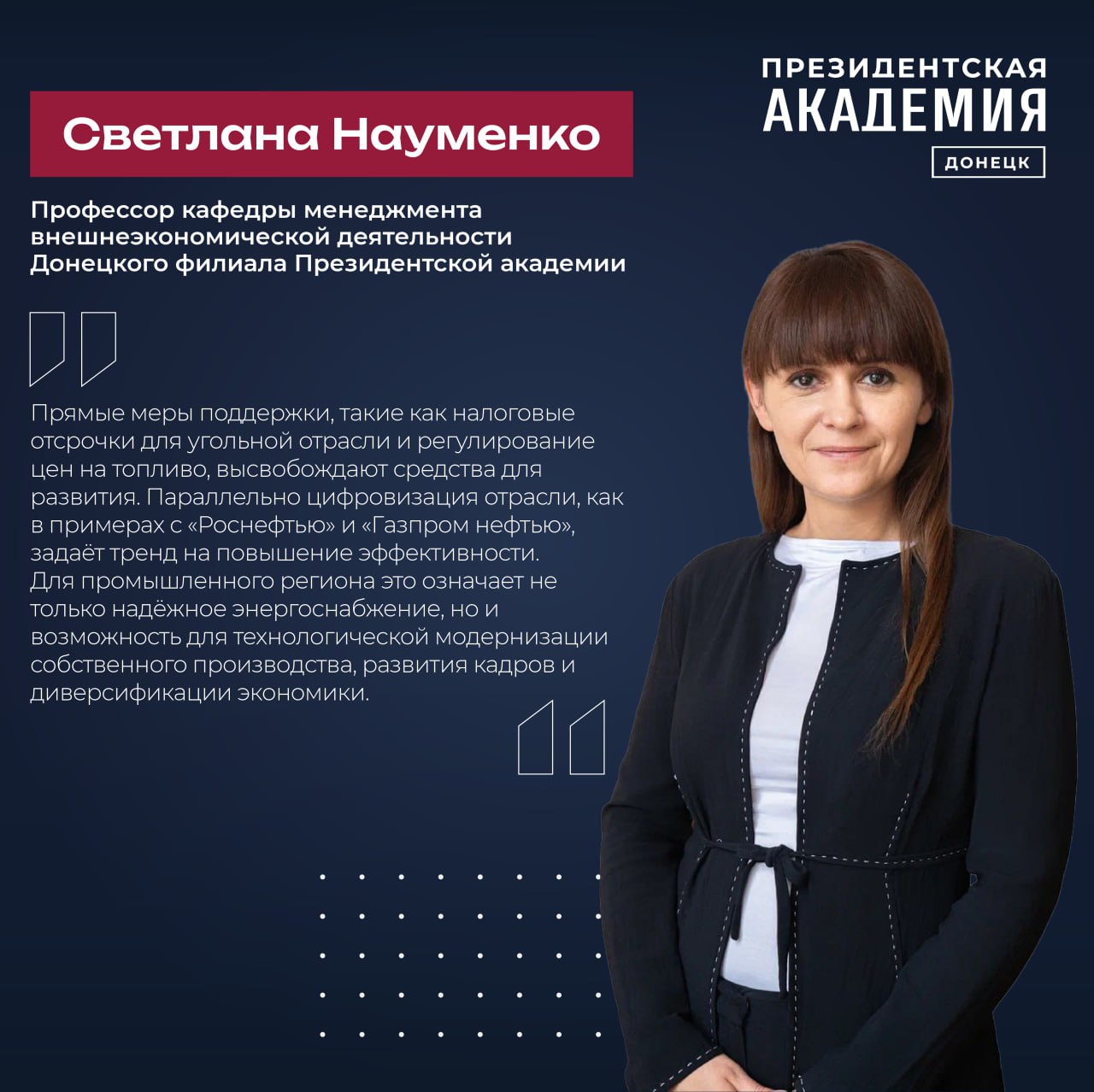 Профессор кафедры внешнеэкономической деятельности Донецкого филиала Президентской академии Светлана Науменко отмечает, что «Прямые меры поддержки, такие как налоговые отсрочки для угольной отрасли и регулирование цен на топливо, высвобождают средства для развития. Параллельно цифровизация отрасли, как в примерах с «Роснефтью» и «Газпром нефтью», задаёт тренд на повышение эффективности. Для промышленного региона это означает не только надёжное энергоснабжение, но и возможность для технологической модернизации собственного производства, развития кадров и диверсификации экономики».
