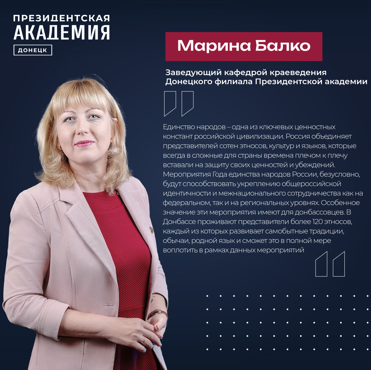 «Единство народов – одна из ключевых ценностных констант российской цивилизации. Россия объединяет представителей сотен этносов, культур и языков, которые всегда в сложные для страны времена плечом к плечу вставали на защиту своих ценностей и убеждений. Мероприятия Года единства народов России, безусловно, будут способствовать укреплению общероссийской идентичности и межнационального сотрудничества как на федеральном, так и на региональных уровнях. Особенное значение эти мероприятия имеют для донбассовцев. В Донбассе проживают представители более 120 этносов, каждый из которых развивает самобытные традиции, обычаи, родной язык и сможет это в полной мере воплотить в рамках данных мероприятий»